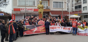 CHP İlçe Başkanlığı’ndan, Cumhuriyet Alanı’na yürünerek, Atatürk Anıtı’na “çelenk” konuldu ve burada günün önemini vurgulayan konuşmalar yapıldı; AKP’nin “emek karşıtı” tutumu kınandı (Fotoğraf Erhan YILMAZ).
