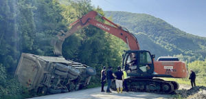 Kazanın ardından olay yerine çağrılan iş makinesi, kamyonu önce düzeltti, ardından çekerek yeniden yola çıkarıldı.