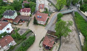 Evrenye Köyü’nde yoğun yağmur nedeniyle derenin taşması sonucu çok sayıda ev sular altında kaldı.