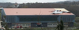 2020’de yapılan spor salonunun çatı kaplaması fırtına nedeniyle yerinden sökülerek çevreye savruldu.